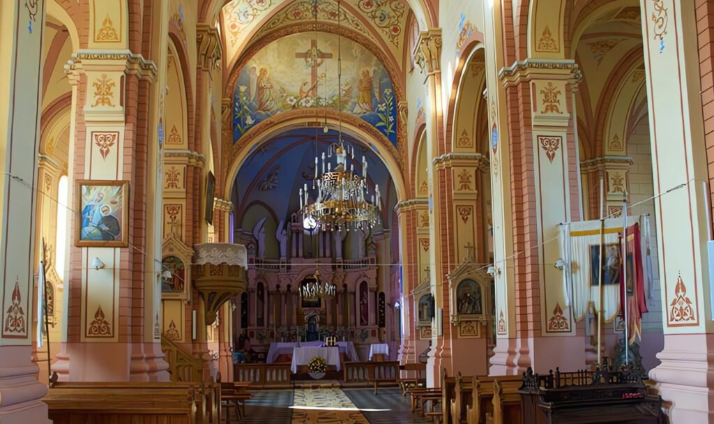 Główna fasada kościoła, flankowana czterokondygnacyjnymi wieżami z dzwonnicami zakończonymi iglicami, imponuje majestatycznym wyglądem. Wnętrze podzielone jest kolumnami na trzy nawy, zwieńczone sklepieniami krzyżowymi zdobionymi ornamentami roślinnymi w stylu secesyjnym. Centralne miejsce zajmuje ołtarz główny w stylu neoromańskim, z cudownym obrazem Matki Bożej Miłosierdzia, otoczonym figurami św. Mikołaja i św. Kazimierza. W niszach bocznych ołtarzy znajdziemy równie wyrafinowane dzieła, m.in. obraz św. Michała Archanioła z elementami modernistycznymi.