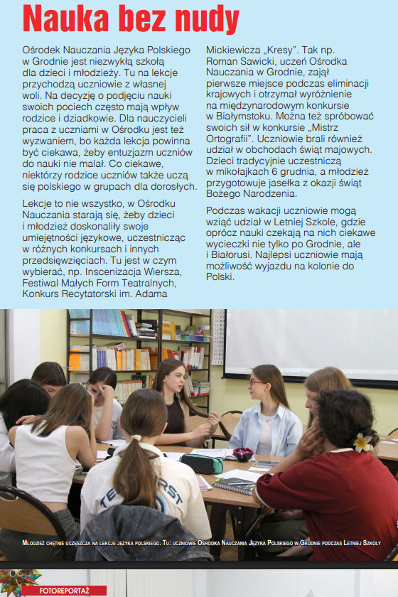 Szczególne miejsce w numerze zajmuje fotoreportaż „Nauka bez nudy”, ukazujący codzienność Ośrodka Nauczania Języka Polskiego w Grodnie — szkoły niezwykłej, bo odwiedzanej przez uczniów z własnej inicjatywy. Wybór nauki języka polskiego często wspierają rodzice i dziadkowie, a nauczyciele dokładają wszelkich starań, by każda lekcja była inspirująca, kreatywna i pełna przeżyć. Co ciekawe, w zajęciach uczestniczą nie tylko dzieci i młodzież — w grupach dla dorosłych uczą się również rodzice uczniów.