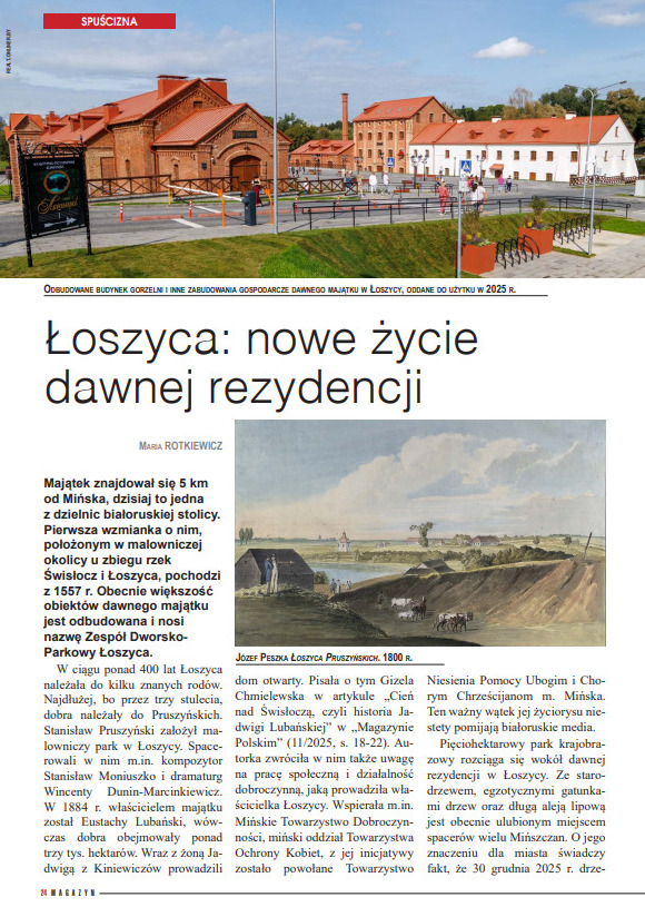 W numerze znalazł się również artykuł Marii Rotkiewicz „Łoszyca: nowe życie dawnej rezydencji”, przedstawiający dzieje majątku położonego niegdyś 5 km od Mińska, a dziś w granicach białoruskiej stolicy. Pierwsza wzmianka o Łoszycy pochodzi z 1557 roku, a malownicze położenie u zbiegu rzek Świsłocz i Łoszyca przez wieki przyciągało uwagę podróżnych i badaczy. Dziś większość obiektów dawnego majątku została odbudowana, tworząc imponujący Zespół Dworsko‑Parkowy Łoszyca.