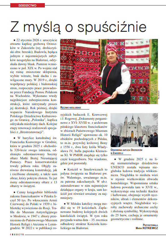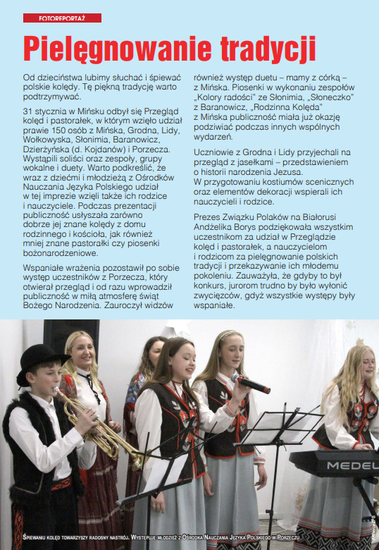 Niezwykle barwnym i pełnym nadziei punktem numeru jest fotoreportaż „Pielęgnowanie tradycji”. Przenosi on czytelników do Mińska, gdzie odbył się Przegląd Kolęd i Pastorałek. To wydarzenie pokazało niezwykłą skalę zaangażowania polskiej społeczności – wzięło w nim udział blisko 150 osób z tak odległych ośrodków jak Grodno, Lida, Wołkowysk, Słonim, Baranowicze czy Porzecze.