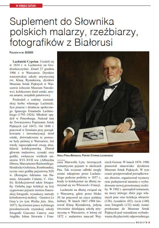 „Magazyn Polski” konsekwentnie pielęgnuje pamięć o wybitnych jednostkach, które tworzyły polską kulturę na styku tradycji i narodów. W tym numerze kontynuujemy Suplement do Słownika polskich malarzy, rzeźbiarzy i fotografików z Białorusi. To fascynujące kompendium wiedzy o twórcach, których dzieła zdobią europejskie galerie, a których biografie nierozerwalnie związane są z ziemią białoruską. Przybliżając sylwetki znanych artystów, redakcja przywraca im należne miejsce w panteonie polskiej kultury, inspirując młode pokolenia do poszukiwania własnych dróg ekspresji.